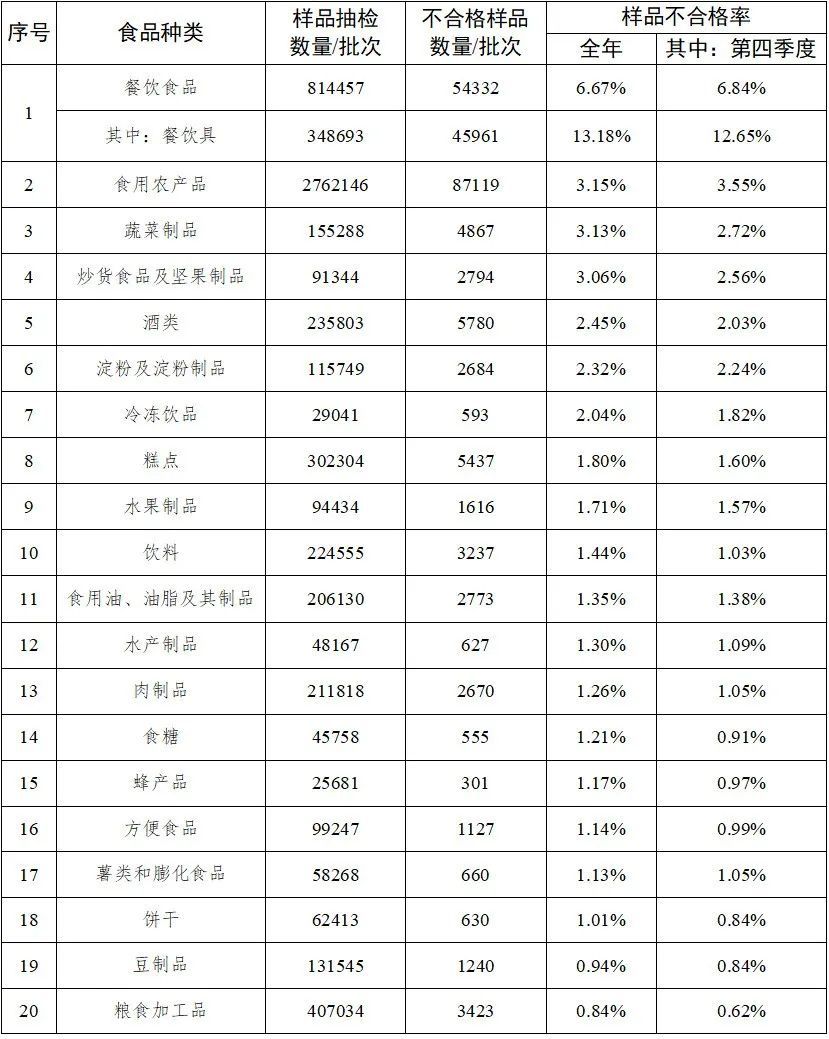 2021年,全国市场监管部门坚持以问题为导向,完成食品安全监督抽检6954438批次,依据有关食品安全guo家标准等进行检验,发现不合格样品187368批次,监督抽检不合格率为2.69%,较2020年上升0.38个百分点。其中,第四季度监督抽检不合格率为2.85%。